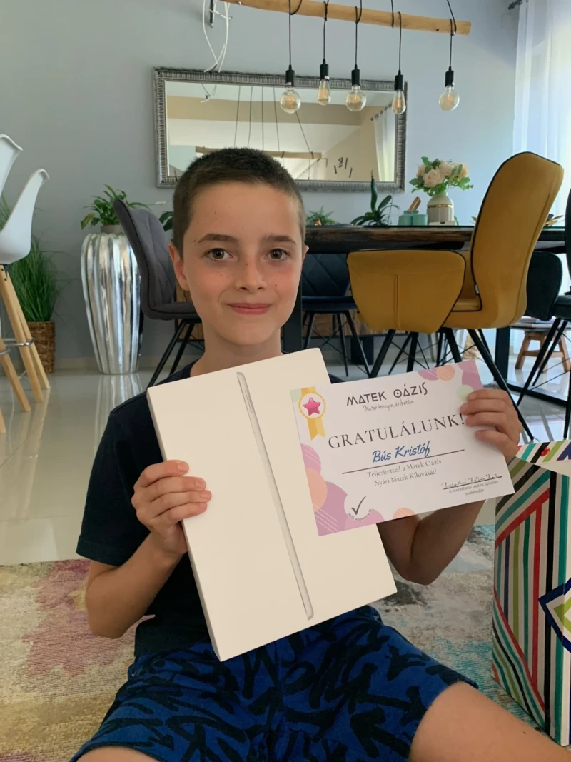 Kristóf a mai nap folyamán megkapta a nyereményét, aminek nagyon nagyon örült!!!! Pár napja vettem észre egy e-mailt, hogy ismételten gratuláltok a nyereményhez és a héten megérkezik hozzánk! Nagyon meglepődtem, mert az első e-mailt valahogy nem kaptam meg. Így nem is tudtuk, hogy mit nyert Kristóf! Mi csak egy kisebb ajándékcsomagra számítottunk, így hatalmas meglepetés volt, mikor átvettük a futártól! Kristóf nagyon boldog! Holnap le is töltjük a matekoázist, hogy végre ne a kis telefonon kelljen megoldania a feladatokat! Végtelenül hálásak vagyunk nektek!!! A weboldal pedig nagyon szuper, már több anyukának ajánlottam! Örülök, hogy rátok találtam!!!