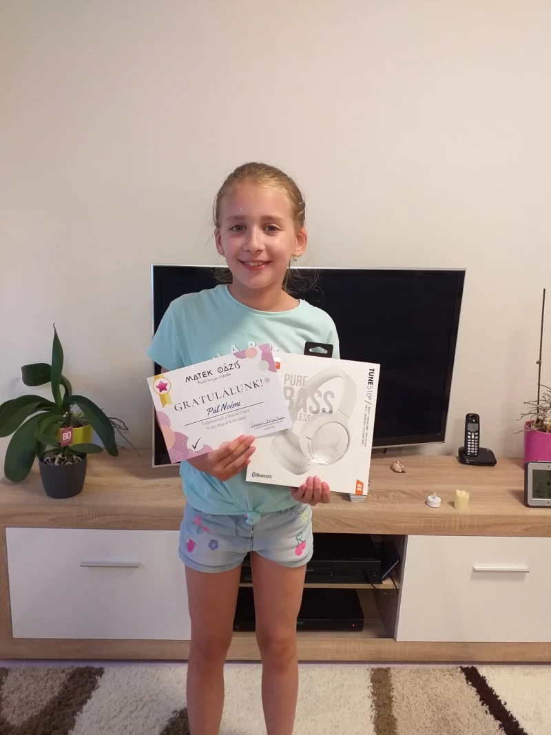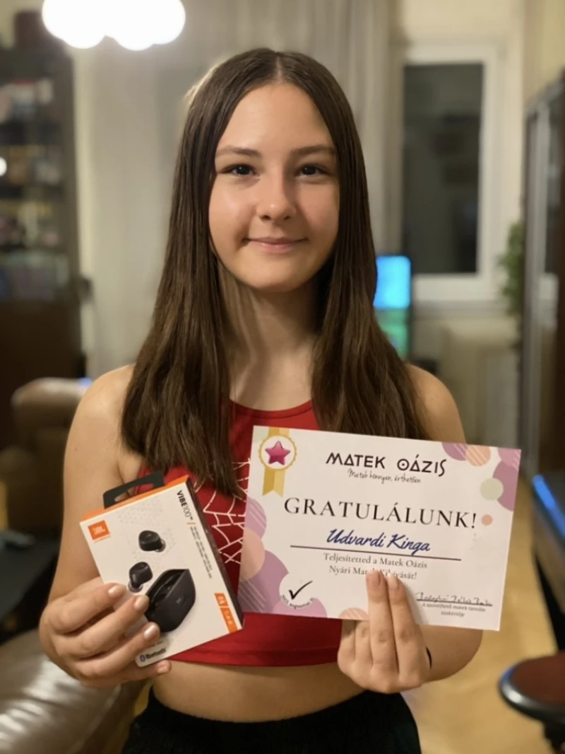 Udvardi Kinga vagyok, idén már 10. osztályos tanuló, a nyári kihívás egyik, s egy jbl fülhallgató nyertese. Hogy őszinte legyek, azért vettem részt a kihívásban mert volt nyeremény és az kellő motivációt adott a matekozáshoz nekem, ugyan tudtam, hogy csekély az esélye annak, hogy egy nyereménnyel gazdagodjak. A matek oázis jól és érthetően magyarázza el az adott tananyagokat és tökéletesen bemutatja hogy a matek nem is igazán nehéz. Remélem hogy most így ősszel a jegyeimen is fog látszani a javulás és idén ismét 5-ös lehetek matematikából.