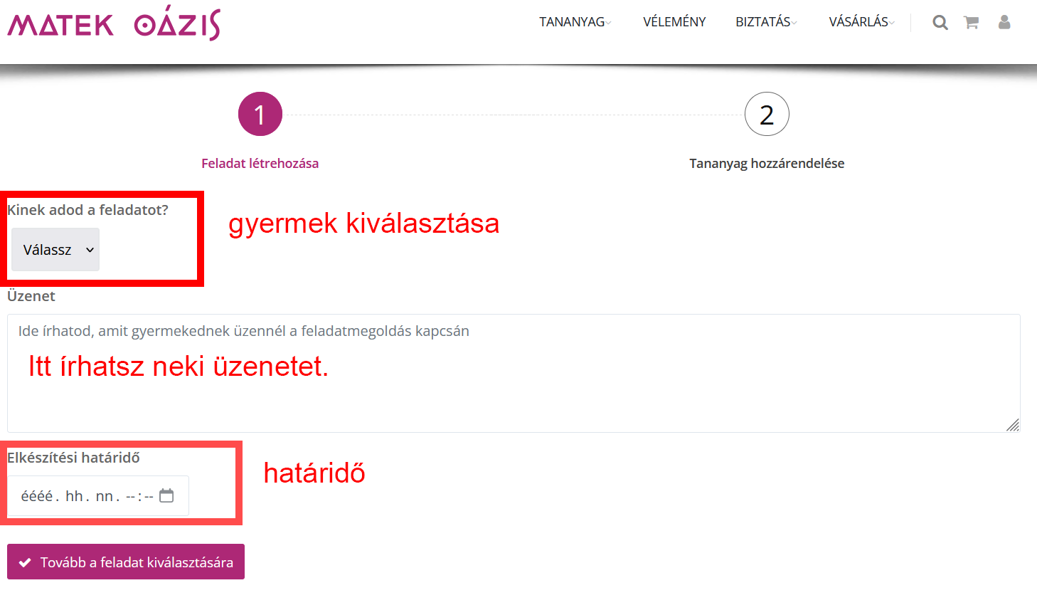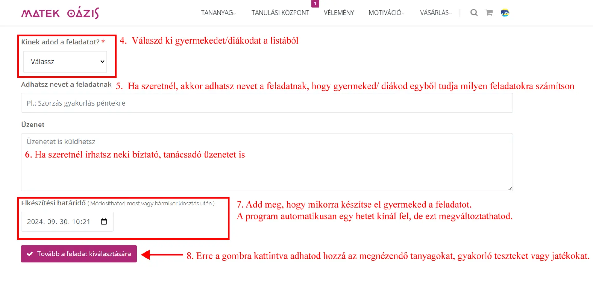 Ha akarod, aktívan segítheted gyermeked tanulását – úgy, hogy közben megmarad az önállósága is. A Matek Oázis feladatkiosztó funkciója épp ehhez ad hatékony eszközt a kezedbe. Lehetőséget ad arra, hogy Te is részt vegyél a tanulási folyamat irányításában: személyre szabottan adhatsz feladatot gyermekednek, pont abból, amire épp szüksége van.