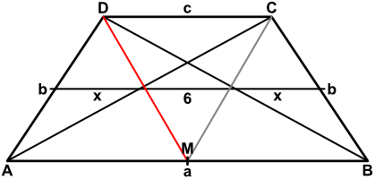 ABCD egyenlőszárú trapéz. AB II CD-vel, AB >CD, Kerülete 60 cm. Trapéz középvonalának hossza 18 cm, átlók felezőpontját összekötő szakasz 6 cm. Számítsd ki a trapéz alapjainak hosszát, számítsd ki a nem párhuzamos oldalak hosszát! Legyen M a nagyalap felezőpontja. Mutasd meg, hogy MD az AMC szög szögfelezője.