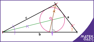 Ezután szerkesztünk két szögfelezőt (zöld és barna egyenesek), ezek metszéspontja adja meg a beírt kör O középpontját.