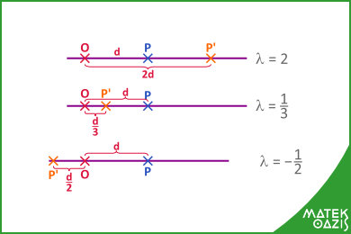 - ha P ≠ O, akkor P' az OP egyenes azon pontja, amelyre teljesül, hogy OP' = | λ | · OP, és ha λ > 0. akkor P' az OP félegyenes pontja, ha λ <0, akkor az O pont P és P' között van.