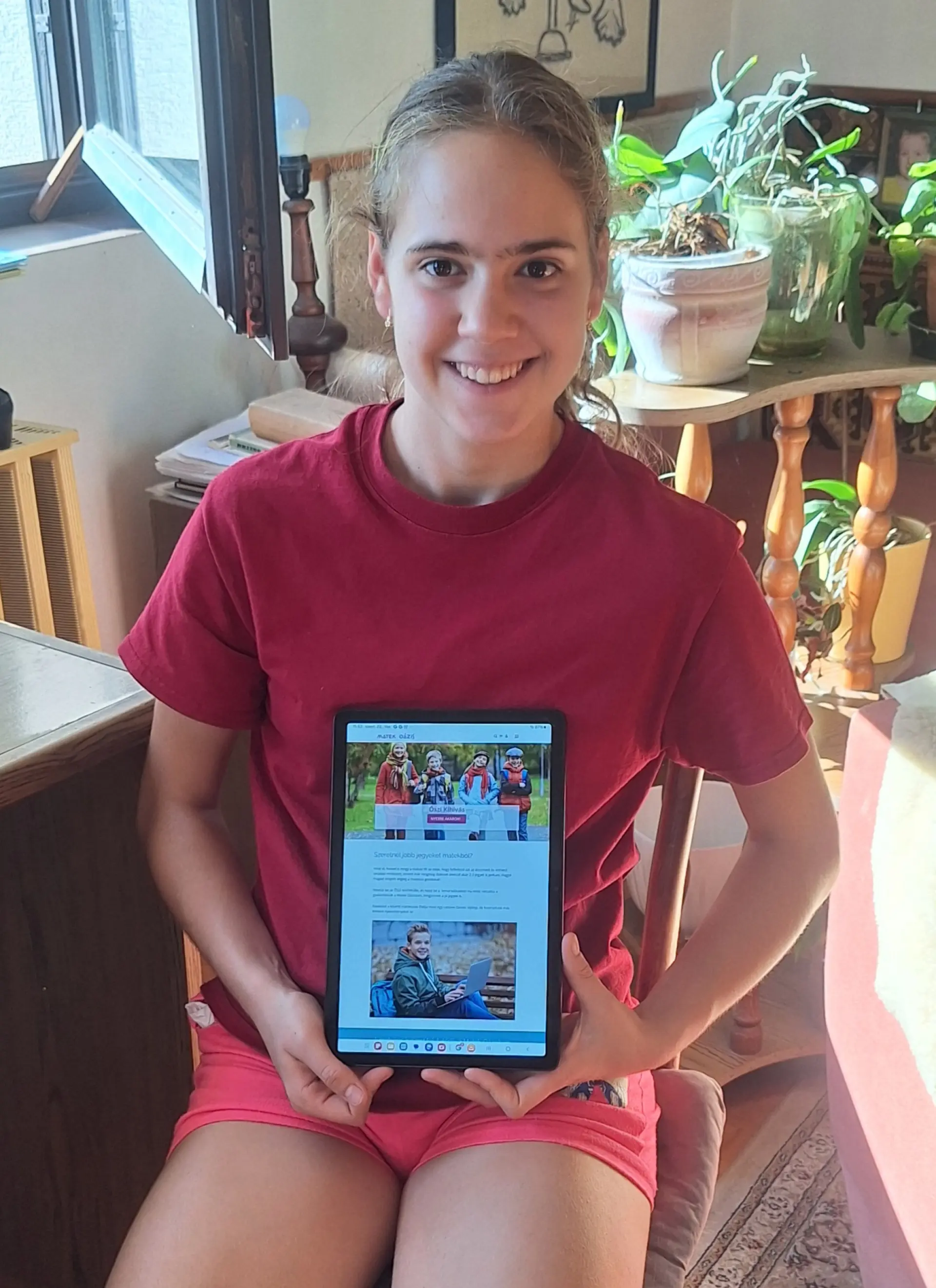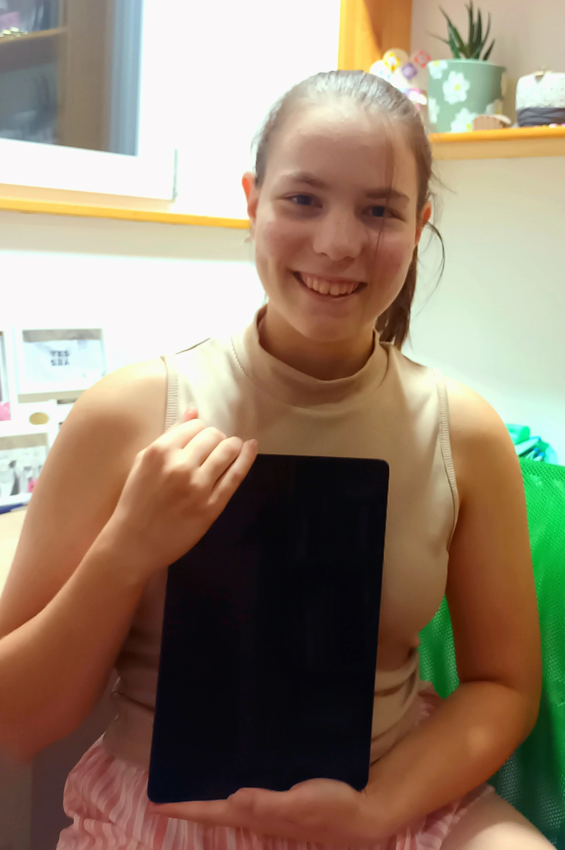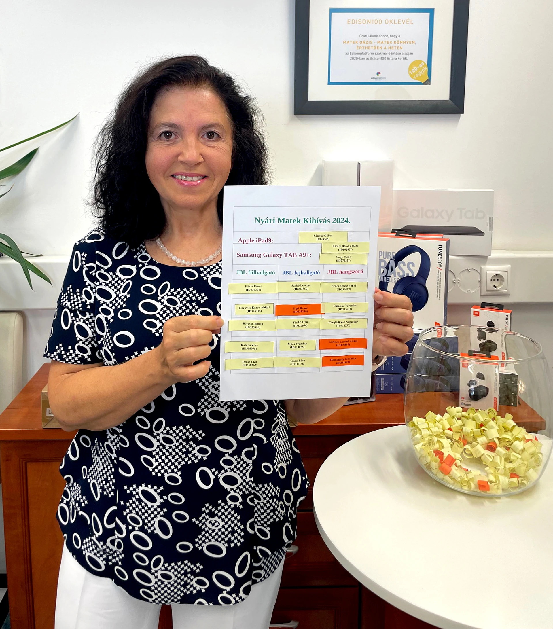 "A nyeremény tablet ma délután rendben megérkezett hozzánk. Nagyon köszönjük, nagy volt az öröm! :) Külön köszönjük a figyelmeztető e-mailt, amit a kihívás vége előtt kaptunk Tőletek. Blanka egész nyáron szorgalmasan matekozott, de elkerülte a figyelmünket, hogy a kihívásra külön nevezni kell. Ha nem írtatok volna nekünk, Blanka kimaradt volna. Amikor beneveztem őt, gondoltam, mennyire örül majd, amikor az elismerő oklevél megérkezik. Amikor kiderült, hogy nyert is, óriási volt az öröm. :) A nyári matekozással Blanka szerette volna a tavaly tanultakat megerősíteni. Ez sikerült is, hiszen az év eleji felmérője a tavalyi 53%-hoz képest idén 86%-osra sikerült, ezzel a negyedik legjobb eredményt érte el az osztályában. Nagyon boldog, mi pedig büszkék vagyunk rá. :) Jó volt látni, hogy örömmel ül le matekozni. Nem kellett noszogatni, magának osztotta be az idejét és végig is ért a hatodikos ismétlő anyagon. Szeretné tovább folytatni a matekozást Veletek, ezért már be is neveztünk a következő kihívásba. :) A hétvégén pedig beszerezzük a hozzáférést a hetedikes anyaghoz is. Mellékelem a képet a boldog Nyertesről. :) Köszönjük Nektek! Üdvözlettel: "
