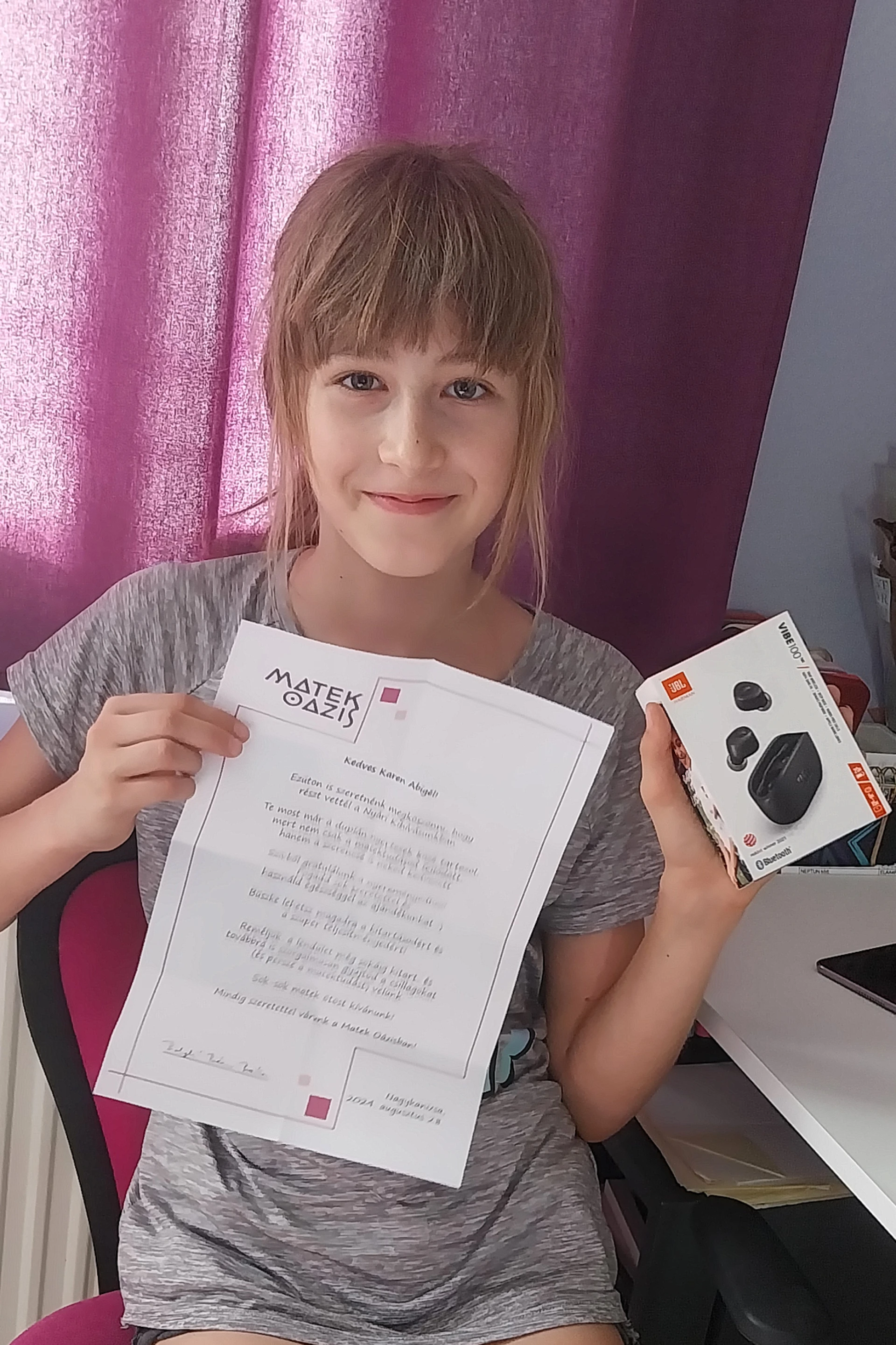 "Nagyon szépen köszönöm a Nyári Kihívásban szerzett nyereményemet. Épségben megérkezett, és igazán örülök neki. Még soha nem nyertem semmi komolyabb dolgot. A kihívásban két okból vettem részt: Főleg azért, mert nagyon szerettem volna nyerni 😀, de segített a fejszámolásom gyorsabbá tételében is. Általában nincs gondom a matekkal, de volt már olyan, amit a Matek Oázis videók jobban elmagyaráztak. Még egyszer köszönöm a nyereményt, és természetesen indulok az Őszi Kihívásban is."