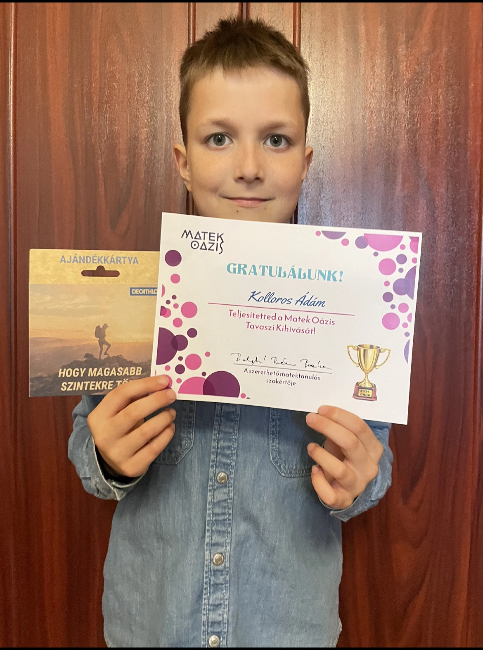 "Ma megkaptam a nyereményemet.Köszönöm szépen , nagyon örültem neki! Továbbra is használom a Matek Oázist, mert úgy érzem sokat segít a feladatok megértésében. A kihívásokat nagyon szeretem, mert így még ismétlem is a tananyagokat. Még egyszer köszönöm szépen és szép napot kívánok!"