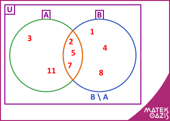 A két halmaz különbségének felírásakor felírjuk az B halmaz elemeit, kivéve azokat, amik a metszetbe kerültek, így: B \ A = {1; 4; 8}.