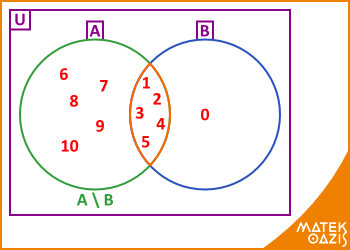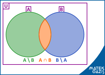 A és B halmaz különbsége a halmazábrán a zölddel jelölt rész (A \ B). A kék rész pedig B és A halmaz különbsége (B \ A). A narancssárga rész a két halmaz metszete (A ⋂ B).