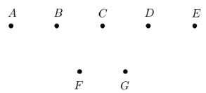 b) Hány olyan háromszög van, amelynek a csúcsait az ábrán szereplő 7 pont közül választjuk ki? (Két háromszöget különbözőnek tekintünk, ha legalább az egyik csúcsukban eltérnek egymástól.)