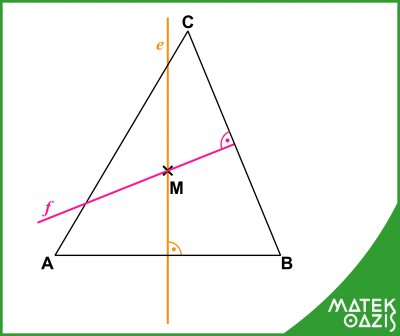 2. lépés: Mivel az e egyenes egy oldalfelező merőleges, ezért minden pontja, így az M pontja is egyenlő távolságra van a háromszög A és B pontjától. Tehát felírhatjuk, hogy MA = MB. Hasonlóan megvizsgáljuk az f oldalfelező merőlegest. Ezen az oldalfelező merőlegesen is rajta van az M pont, tehát kijelenthető, hogy MC = MB.
