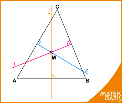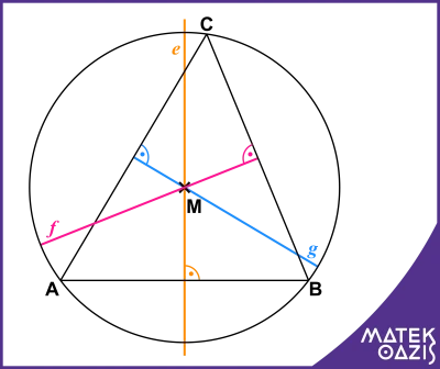 Ez az összefüggés viszont azt jelenti, hogy az M pont egyenlő távolságra van a háromszög A és C csúcsától. Ebből pedig az következik, hogy az M pont rajta van a háromszög AC oldalának felezőmerőlegesén (g) is.