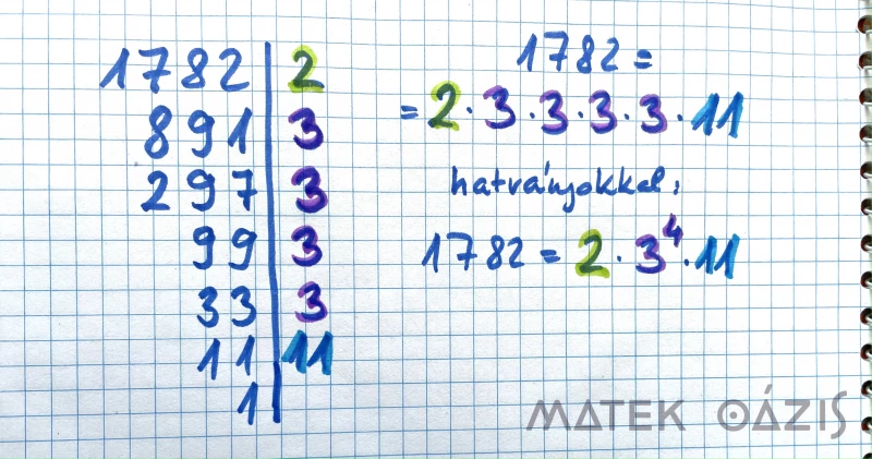 Pl. 1782-t akarjuk felbontani prímtényezők szorzatára. Mivel páros, a 2-t mindjárt leírjuk, és elosztunk vele. A hányados így 891. Keresünk egy olyan prímet, amivel osztható - (most pl. 3 ilyen, hisz a számjegyek összege osztható 3-mal.) Elosztjuk vele, aztán a hányadoshoz is keresünk olyan prímet, amivel az osztható (3 még mindig jó), stb…: