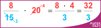 Ebben az esetben, mivel a számmal a számlálót kell megszorozni, ezért a számlálóhoz számíthatjuk a 20-at is. Így a 20-at és a 15-öt is, a számlálót és a nevezőt is el tudjuk osztani ugyanazzal a számmal, vagyis 5-tel. 20-ban az 5 megvan 4-szer, úgy jelöljük, hogy a 20-at áthúzzuk és mellé 4-et írunk.15-ben az 5 megvan 3-szor, a 15-öt áthúzzuk, és mellé 3-at írunk. Így tehát a 8-at 4-gyel kell megszorozni, az 32, ez kerül a számlálóba, a nevezőben pedig 3 lesz.