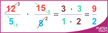 Könnyebben számolhatunk, ha észrevesszük, hogy a számlálóban a 12-t és a nevezőben a 8-at el tudjuk osztani 4-gyel, akkor 12-ben a 4 megvan 3-szor, 8-ban a 4 megvan 2-szer. Ezen kívül a számlálóban még látunk 15-öt, a nevezőben 5-öt, ezeket a számokat el tudjuk osztani 5-tel, így 15-ben az 5 megvan 3-szor, 5-ben az 5 megvan 1-szer. Végül a számlálóban 3-szor 3 lesz, a nevezőben 1-szer 2. Tehát végül a szorzás eredménye 9 ketted.
