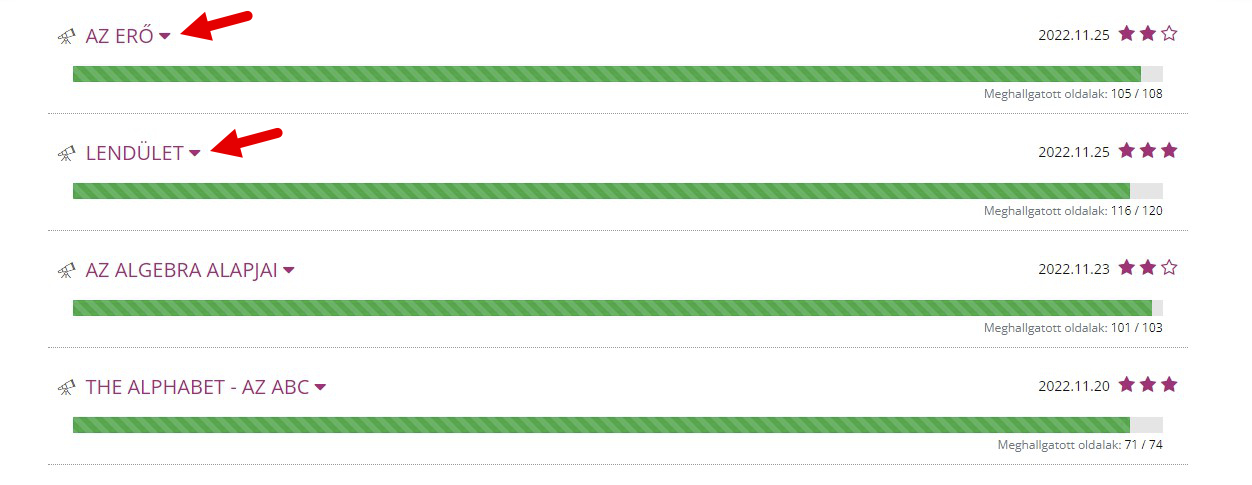 Ha egy ideig nem tudtál foglalkozni a tananyagokkal, akkor a tanulási naplóban bármikor ellenőrizheted, hogy mit dolgoztál, és milyen eredményt értél el. Ha valamelyik videóval nem sikerült csillagot szerezni, vagy csak egyet-kettőt, akkor a következő napon nézd meg újra, biztosan jobban fog már menni.