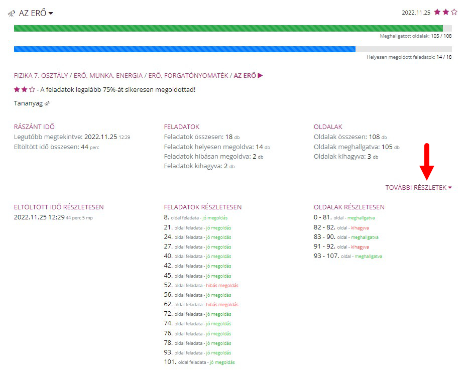 Így mutatja a tanulási napló, hogy melyik tananyagokkal foglalkoztál. A Bővebben szövegre kattintva további részletek nyílnak meg.