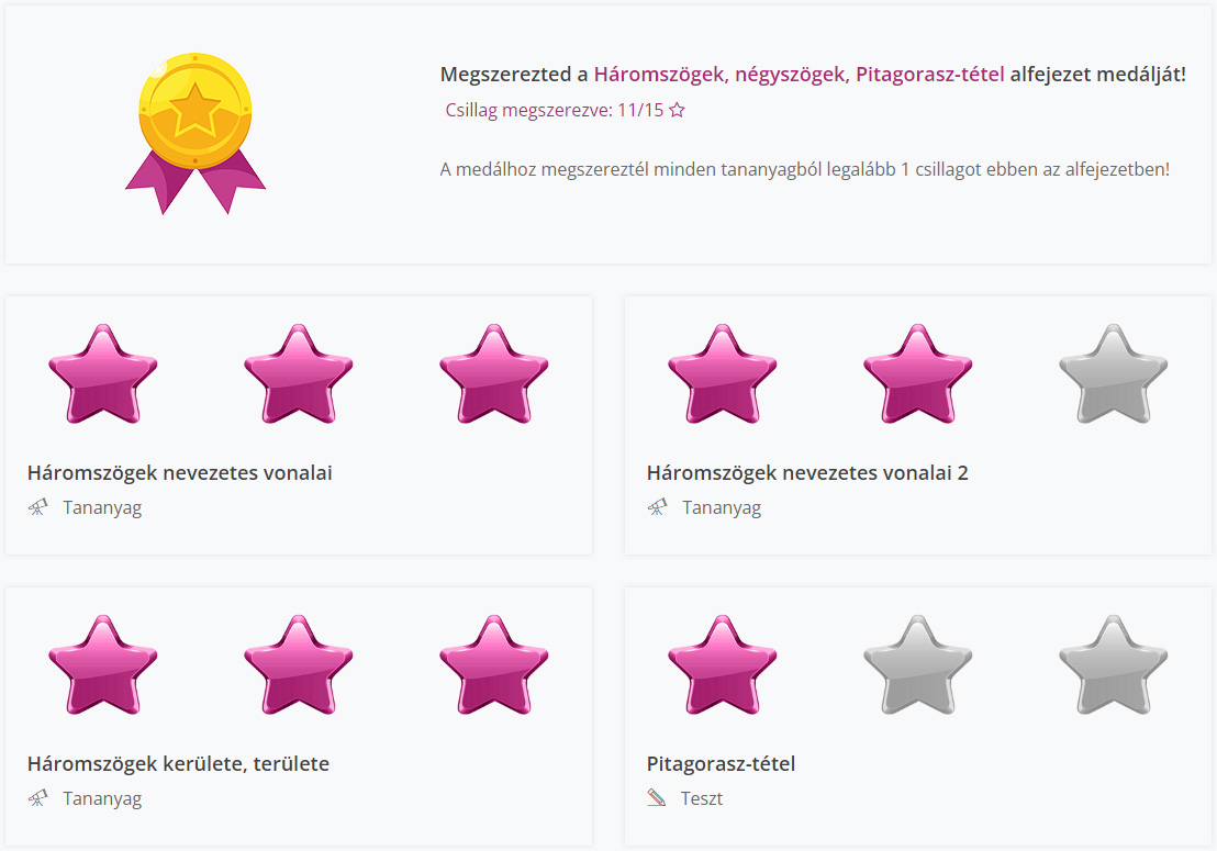 Ha megszerzed a csillagokat a videókra, tesztekre, az azt jelenti, hogy a tudást is megszerezted. Ráadásul sikerélményeket is gyűjtesz közben, és így az önbizalmad is nőni fog matekból.