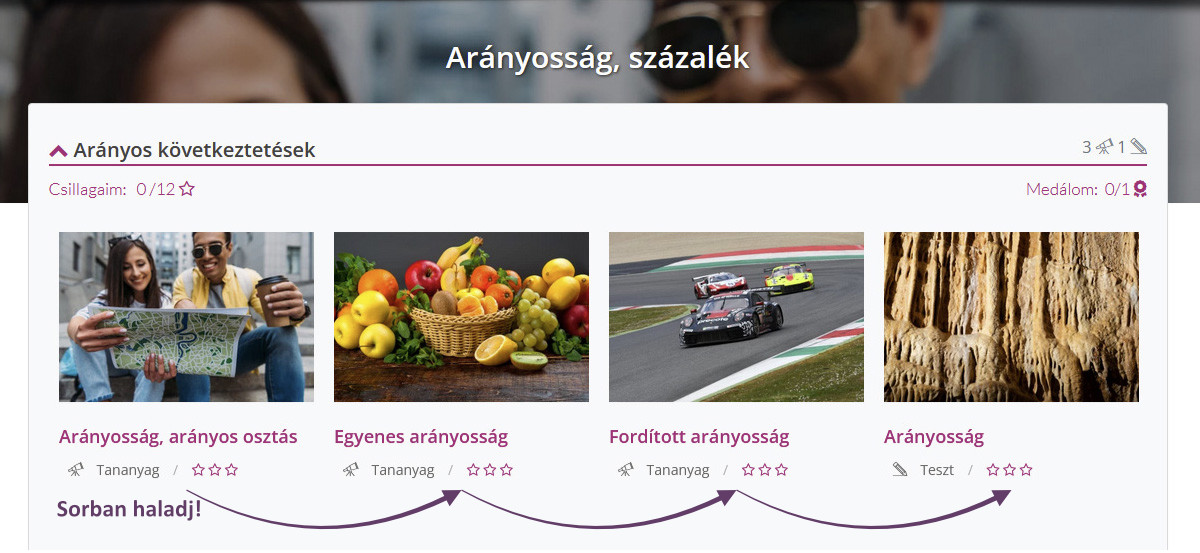 A kurzus oldalán az egy témakörbe (alfejezetbe) tartozó tananyagokat egy sorban találod. Célszerű egymás követő sorrendben átvenni őket az első tananyagtól az utolsóig.