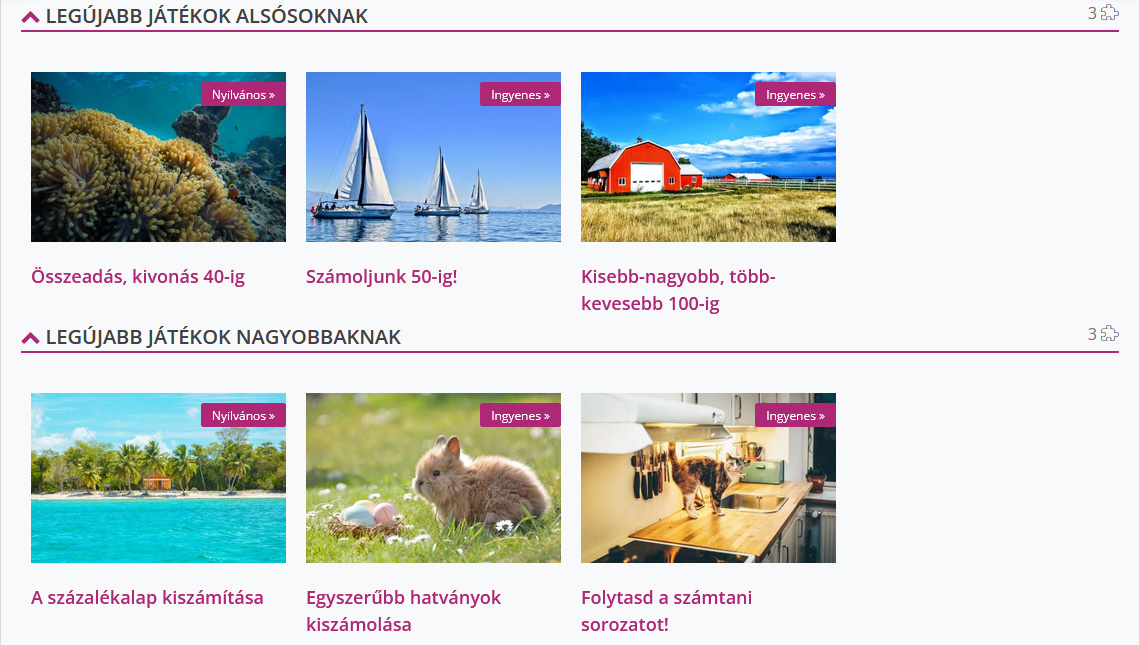 Részlet a Matek játékok oldalból, ahol összegyűjtve megtalálod az összes matekos játékot. Az angol nyelvi kurzus játékait az Angol játékok oldalon gyűjtöttük össze.