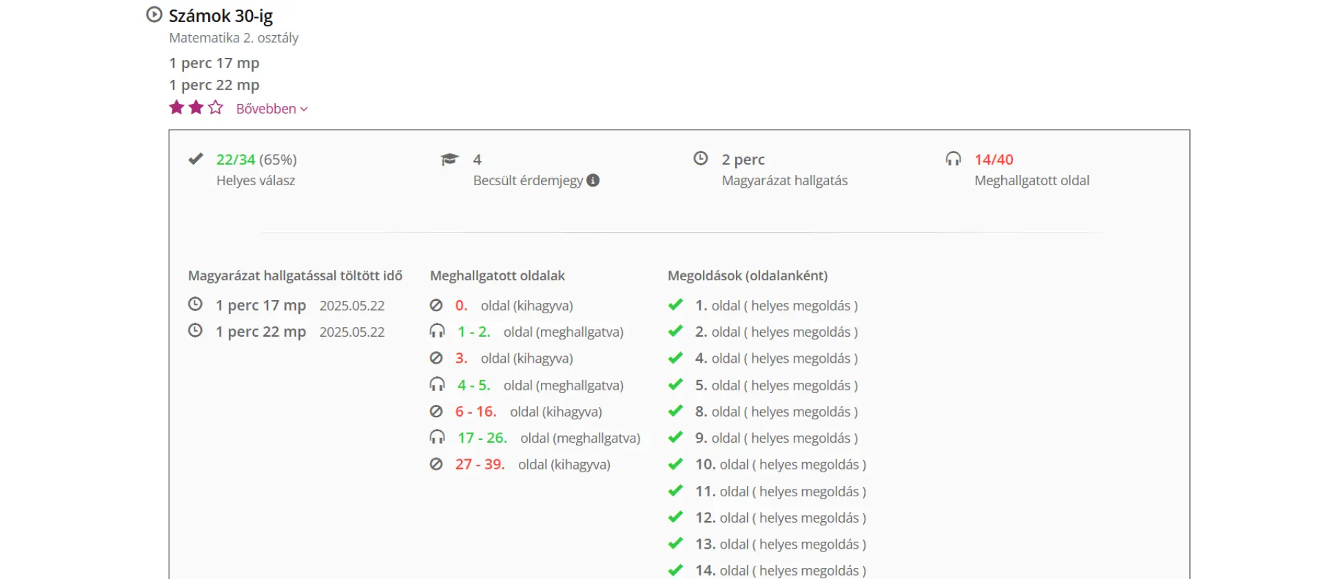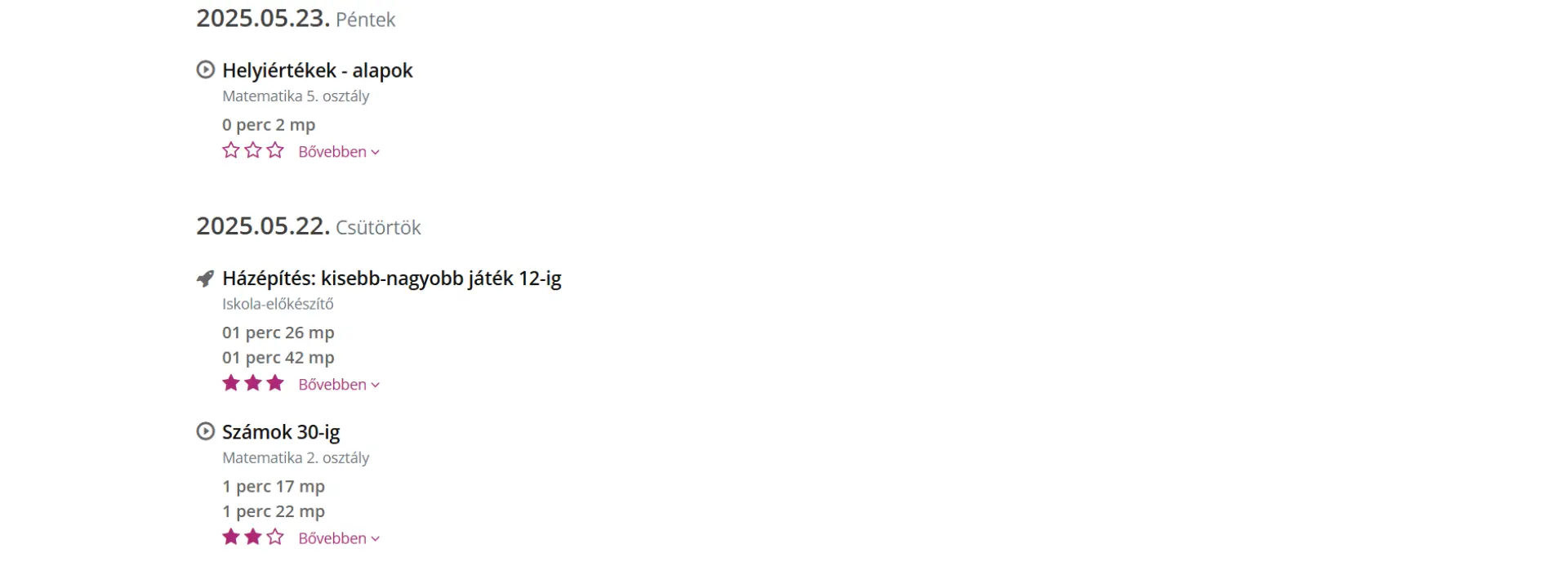 Ha egy ideig nem tudtál foglalkozni a tananyagokkal, akkor a tanulási naplóban bármikor ellenőrizheted, hogy mit dolgoztál, és milyen eredményt értél el. Ha valamelyik videóval nem sikerült csillagot szerezni, vagy csak egyet-kettőt, akkor a következő napon nézd meg újra, biztosan jobban fog már menni.